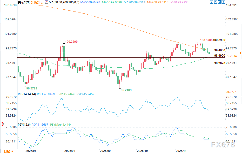 汇通财经APP讯——周一(12月1日)美盘时段,美元指数小幅下滑,空方持续测试关键支撑区域,一旦突破或引发更大幅度下跌。目前指数正逼近99.047的50日均线与98.991的震荡低点,若双双跌破,不仅意味着美元走势转弱,还可能触发清算盘与新的抛售潮,下一个下行目标将指向98.307-97.814的回调区间。当前,只要价格维持在99.669的200日均线下方,美元的最小阻力路径仍偏向下行。