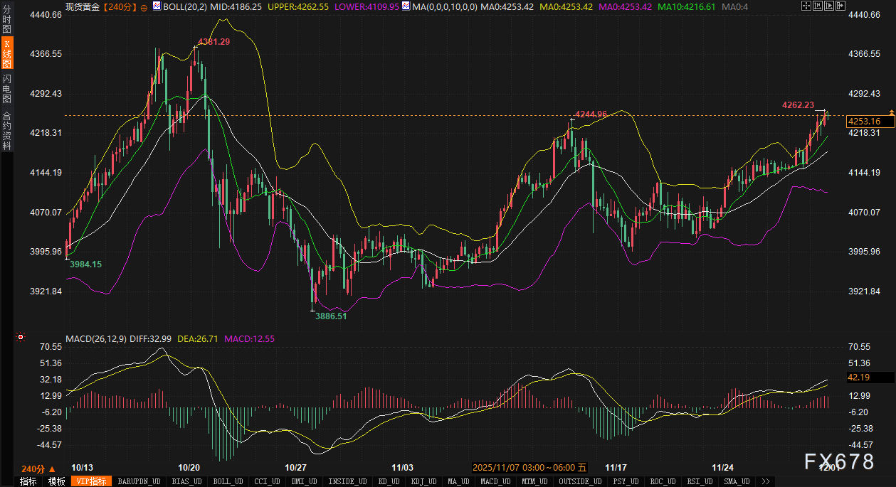 上方阻力:首要关注4260-4270区域(当前布林带上轨延伸区及整数心理关口),若能有效突破,下一目标将指向10月高点(约4280-4300区域)。