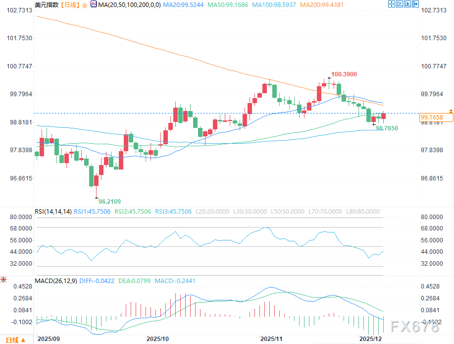 汇通财经APP讯——周一(12月8日)美盘早盘,美元指数小幅走高,交易员试图收复50日均线99.169这一关键水平——守住该位置将为美联储关键会议周的美元短期动能提供稳定性。尽管市场普遍预期周三的降息已被定价,但美元持仓仍保持稳健。