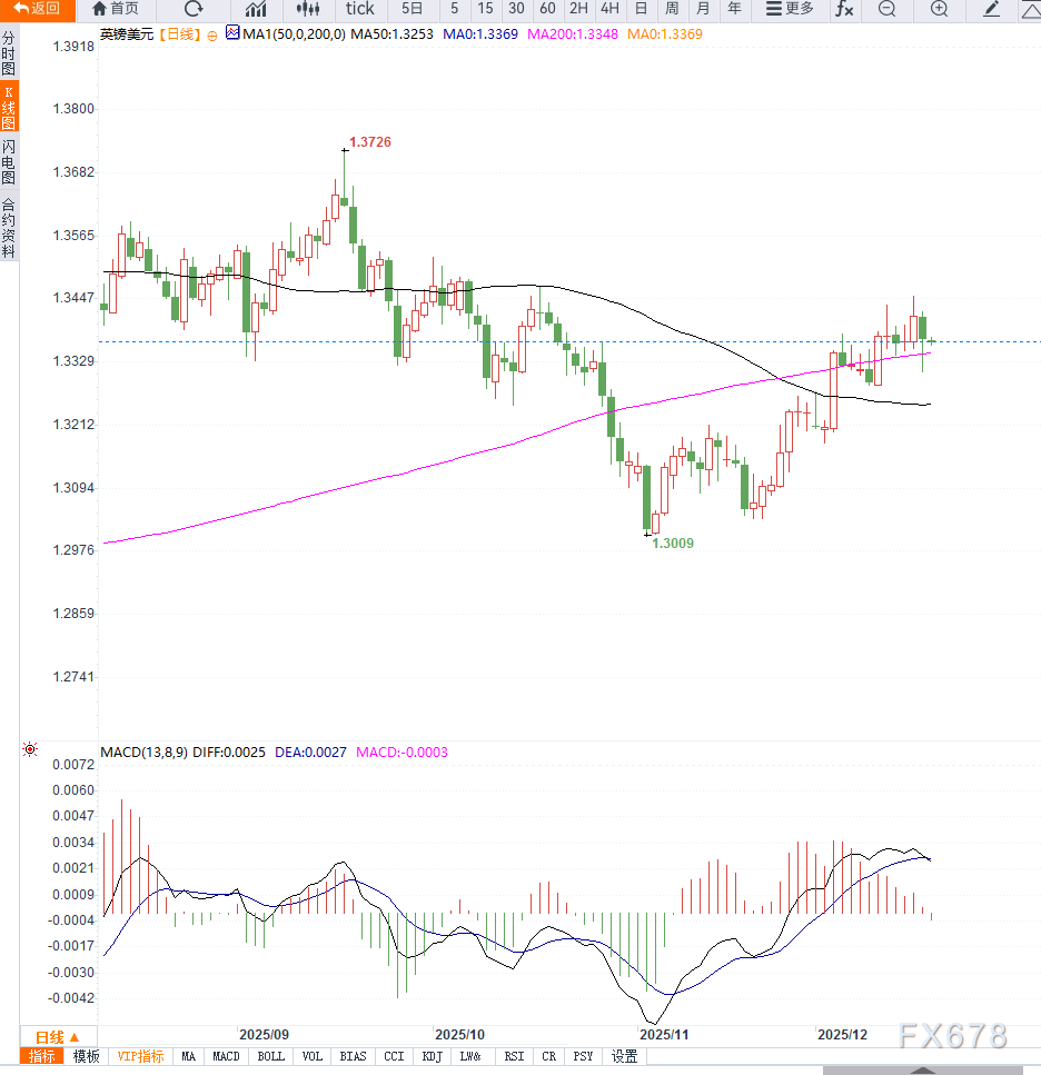 上方若突破 1.3450–1.3480 区间压力,则短线反弹动能或将增强。但整体结构仍偏向弱势整理,趋势性转强信号尚未出现。