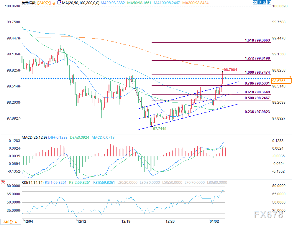 4小时级别图表显示,美元指数现交投于98.70附近,价格正沿着自97.75低点开启的上升通道延续反弹走势。目前价格已收复98.24的50%斐波那契回撤位,眼下正测试98.74一线阻力——该位置同时也是前期的关键支撑位。